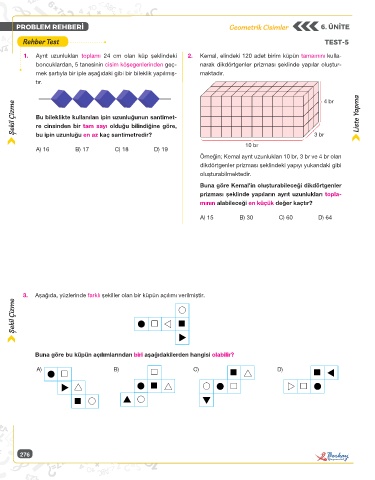 1. Ayrıt uzunlukları toplamı 24 cm olan küp şeklindeki 2. Kemal, elindeki 120 adet birim küpün tamamını kulla-