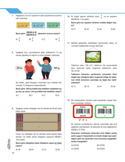 almıştır. İki raftan alınan kitapların sayısının EBOB’u şarta uygun 3 basamaklı en küçük doğal sayı yazıl-