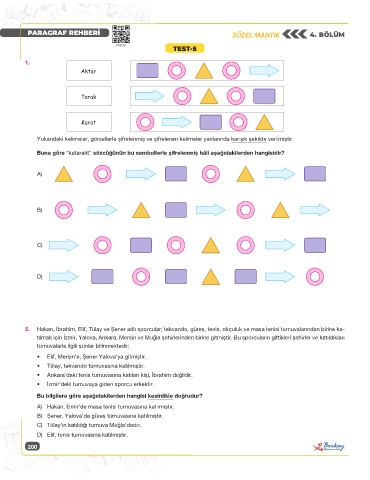 2. Hakan, İbrahim, Elif, Tülay ve Şener adlı sporcular; tekvando, güreş, tenis, okçuluk ve masa tenisi turnuvalarından birine ka-