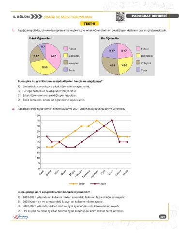 1. Aşağıdaki grafikler, bir okulda yapılan ankete göre kız ve erkek öğrencilerin en sevdiği spor dallarının oranını göstermektedir.