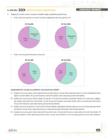 4. Aşağıda bir ankete verilen cevapların yüzdelik değeri grafiklerle gösterilmiştir.