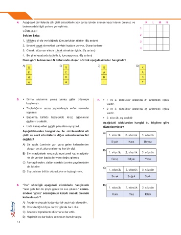 4. Aşağıdaki cümlelerde altı çizili sözcüklerin yay ayraç içinde istenen karşılıklarını bulunuz ve K L M N