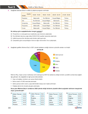 4. Aşağıdaki grafikte Mehmet Bey’in 2021 yılında tarlalarına ektiği ürünlerin yüzdelik oranları verilmiştir: