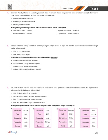 3. Elif, Filiz, Gürkan, Halil ve Nida adlı öğrenciler; hafta içinde farklı günlerde okulda sınıf nöbeti tutacaktır. Bu öğrenciler ve