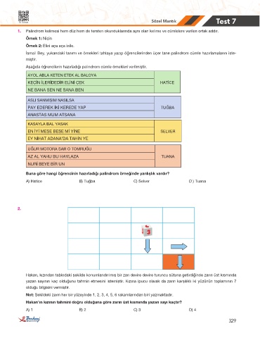 Buna göre hangi öğrencinin hazırladığı palindrom örneğinde yanlışlık vardır?