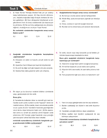 1. (I) Yaşar Kemal “Köroğlu Destanı”nda yer yer anlatıyı 4. Aşağıdakilerden hangisi amaç-sonuç cümlesidir?