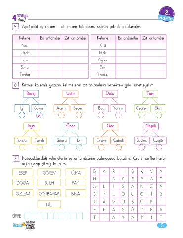 7. Kutucuklardaki kelimelerin eş anlamlılarını bulmacada bulalım. Kalan harfleri sıra-