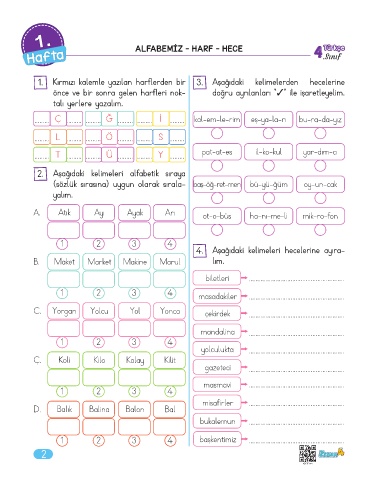 1. Kırmızı kalemle yazılan harflerden bir 3. Aşağıdaki kelimelerden hecelerine