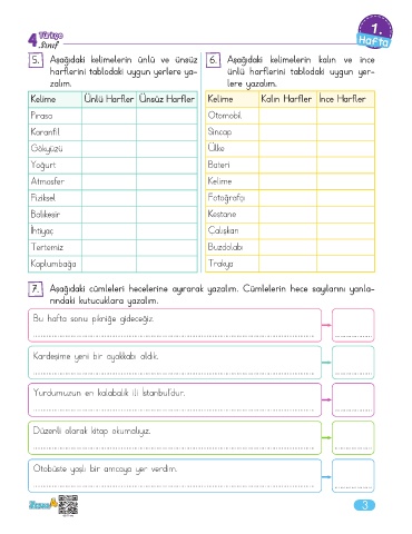 5. Aşağıdaki kelimelerin ünlü ve ünsüz 6. Aşağıdaki kelimelerin kalın ve ince