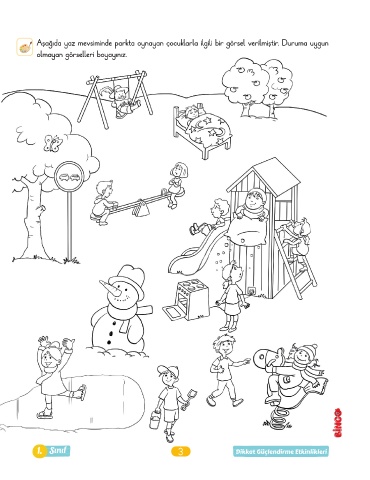 Aşağıda yaz mevsiminde parkta oynayan çocuklarla ilgili bir görsel verilmiştir. Duruma uygun olmayan görselleri boyayınız. 1. Sınıf 3 Dikkat Güçlendirme Etkinlikleri