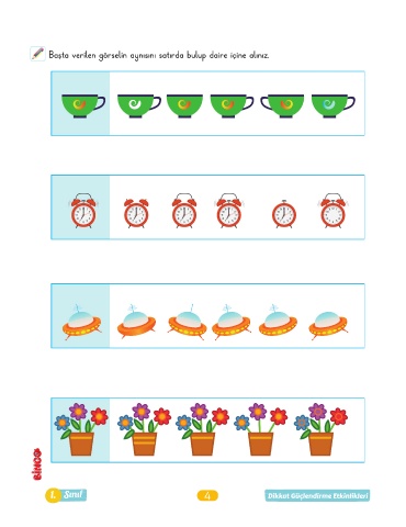Başta verilen görselin aynısını satırda bulup daire içine alınız. 1. Sınıf 4 Dikkat Güçlendirme Etkinlikleri