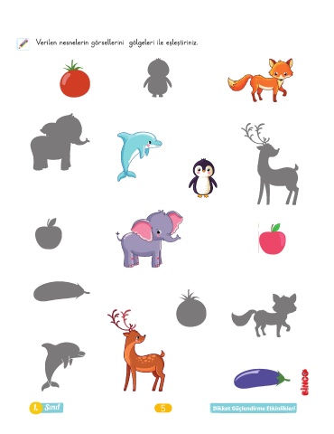 Verilen nesnelerin görsellerini gölgeleri ile eşleştiriniz. 1. Sınıf 5 Dikkat Güçlendirme Etkinlikleri