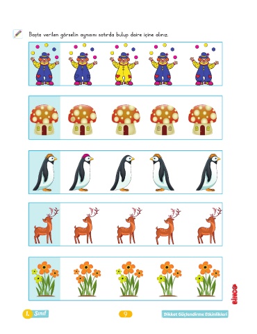 Başta verilen görselin aynısını satırda bulup daire içine alınız. 1. Sınıf 9 Dikkat Güçlendirme Etkinlikleri