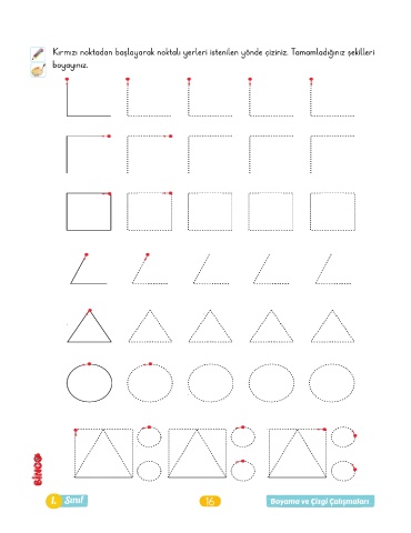 Kırmızı noktadan başlayarak noktalı yerleri istenilen yönde çiziniz. Tamamladığınız şekilleri boyayınız. 1. Sınıf 16 Boyama ve Çizgi Çalışmaları