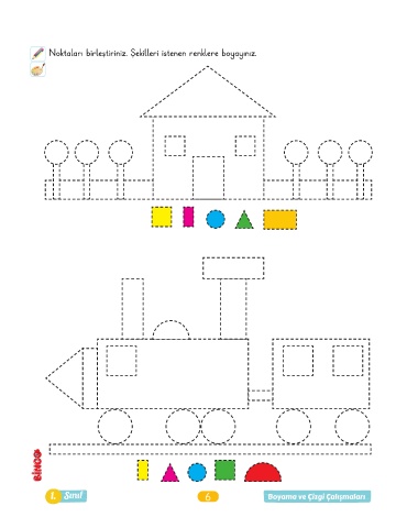 Noktaları birleştiriniz. Şekilleri istenen renklere boyayınız. 1. Sınıf 6 Boyama ve Çizgi Çalışmaları
