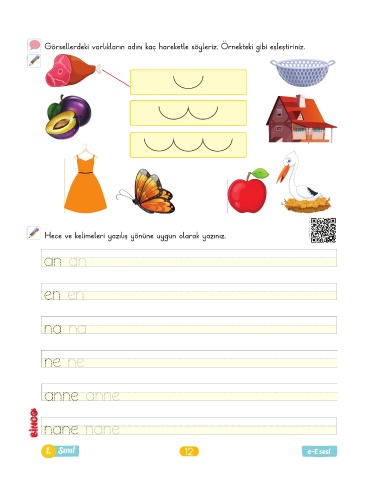 Görsellerdeki varlıkların adını kaç hareketle söyleriz. Örnekteki gibi eşleştiriniz. Hece ve kelimeleri yazılış yönüne uygun olarak yazınız. an an en en na na ne ne anne anne nane nane 1. Sınıf 12 e-E sesi