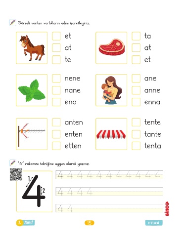 Görseli verilen varlıkların adını işaretleyiniz. et ta at at te et nene ane nane anne ena enna anten tente enten tante etten tenta “4” rakamını tekniğine uygun olarak yazınız. 4 4 4 4 4 4 4 4 4 4 4 4 4 4 4 4 4 4 1. Sınıf 15 t-T sesi