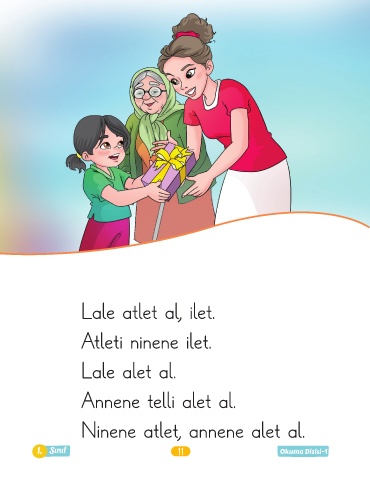 Lale atlet al, ilet. Atleti ninene ilet. Lale alet al. Annene telli alet al. Ninene atlet, annene alet al. 1. Sınıf 11 Okuma Dizisi-