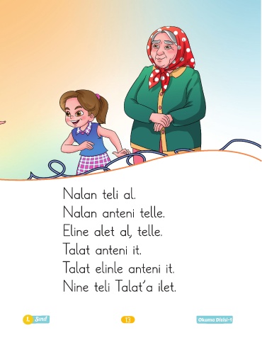 Nalan teli al. Nalan anteni telle. Eline alet al, telle. Talat anteni it. Talat elinle anteni it. Nine teli Talat’a ilet. 1. Sınıf 13 Okuma Dizisi-
