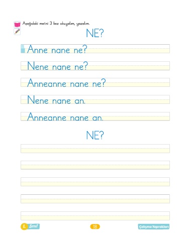 Aşağıdaki metni 3 kez okuyalım, yazalım. NE? Anne nane ne? Nene nane ne? Anneanne nane ne? Nene nane an. Anneanne nane an. NE? 1. Sınıf 18 Çalışma Yaprakları
