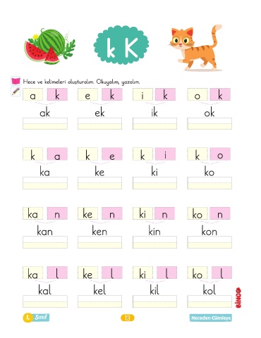 k K Hece ve kelimeleri oluşturalım. Okuyalım, yazalım. a k e k i k o k ak ek ik ok k a k e k i k o ka ke ki ko ka n ke n ki n ko n kan ken kin kon ka l ke l ki l ko l kal kel kil kol 1. Sınıf 13 Heceden Cümleye