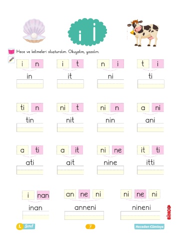 i İ Hece ve kelimeleri oluşturalım. Okuyalım, yazalım. i n i t n i t i in it ni ti ti n ni t ni n a ni tin nit nin ani a ti a it ni ne it ti ati ait nine itti i nan an ne ni ni ne ni inan anneni nineni 1. Sınıf 7 Heceden Cümleye