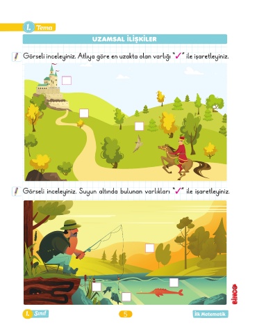 1. Tema UZAMSAL İLİŞKİLER Görseli inceleyiniz. Atlıya göre en uzakta olan varlığı "3” ile işaretleyiniz. Görseli inceleyiniz. Suyun altında bulunan varlıkları " ” ile işaretleyiniz. 1. Sınıf 5 İlk Matematik