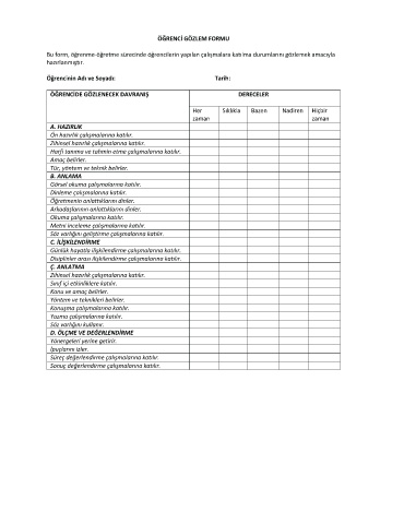 Bu form, öğrenme-öğretme sürecinde öğrencilerin yapılan çalışmalara katılma durumlarını gözlemek amacıyla