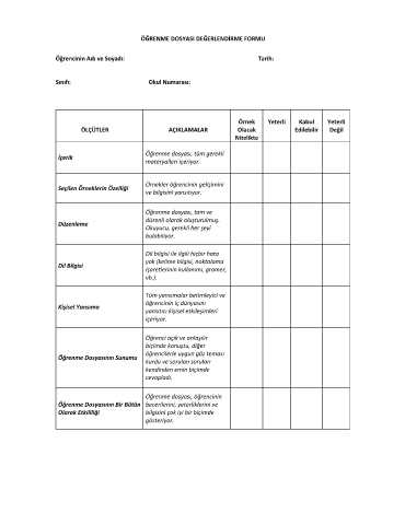 ÖĞRENME DOSYASI DEĞERLENDİRME FORMU