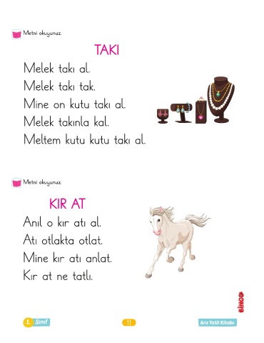 Metni okuyunuz. TAKI Melek takı al. Melek takı tak. Mine on kutu takı al. Melek takınla kal. Meltem kutu kutu takı al. Metni okuyunuz. KIR AT Anıl o kır atı al. Atı otlakta otlat. Mine kır atı anlat. Kır at ne tatlı. 1. Sınıf 11 Ara Tatil Kitabı