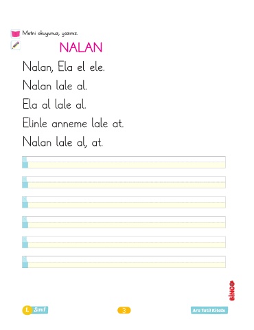 Metni okuyunuz, yazınız. NALAN Nalan, Ela el ele. Nalan lale al. Ela al lale al. Elinle anneme lale at. Nalan lale al, at. 1. Sınıf 3 Ara Tatil Kitabı