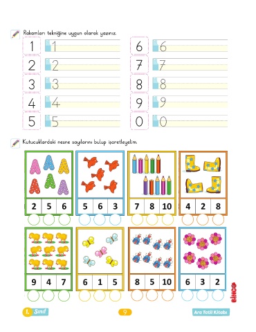 Rakamları tekniğine uygun olarak yazınız. 1 1 6 6 2 2 7 7 3 3 8 8 4 4 9 9 5 5 0 0 Kutucuklardaki nesne sayılarını bulup işaretleyelim. 1. Sınıf 9 Ara Tatil Kitabı