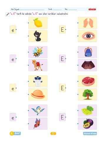 "e, E” harfi ile adında "e, E” sesi olan varlıkları eşleştirelim.