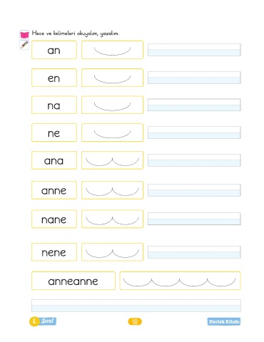 Hece ve kelimeleri okuyalım, yazalım. an en na ne ana anne nane nene anneanne 1. Sınıf 18 Destek Kitabı