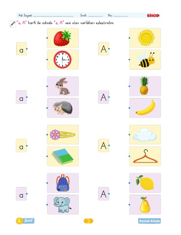 "a, A” harfi ile adında "a, A” sesi olan varlıkları eşleştirelim.