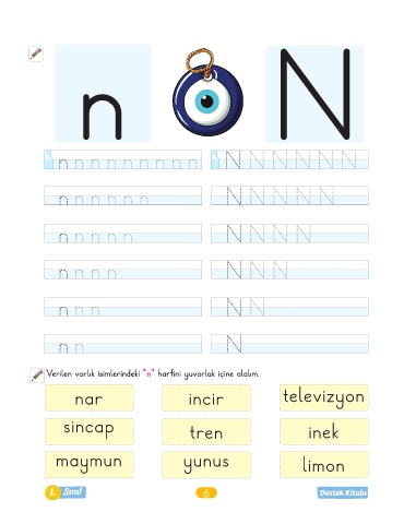 n N n n n n n n n n n N N N N N N n n n n n n N N N N N n n n n n N N N N n n n n N N N n n n N N n n N Verilen varlık isimlerindeki "n” harfini yuvarlak içine alalım. nar incir televizyon sincap tren inek maymun yunus limon 1. Sınıf 6 Destek Kitabı