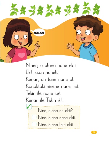 NALAN Ninen, o alana nane ekti. Ekili alan naneli. Kenan, on tane nane al. Konaktaki ninene nane ilet. Tekin ile nane ilet. Kenan ile Tekin ikili. Nine, alana ne ekti? Nine, alana nane ekti. Nine, alana lale ekti. 9