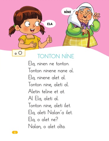 NİNE ELA o O TONTON NİNE Ela, ninen ne tonton. Tonton ninene nane al. Ela, ninene alet al. Tonton nine, aleti al. Aletin teline et at. Al Ela, aleti al. Tonton nine, aleti ilet. Ela, aleti Nalan’a ilet. Ela, o alet ne? Nalan, o alet olta. 4