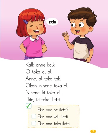 EKİN Kalk anne kalk. O toka al al. Anne, al toka tak. Okan, ninene toka al. Ninene iki toka al. Ekin, iki toka iletti. Ekin ona ne iletti? Ekin ona koli iletti. Ekin ona toka iletti. 7