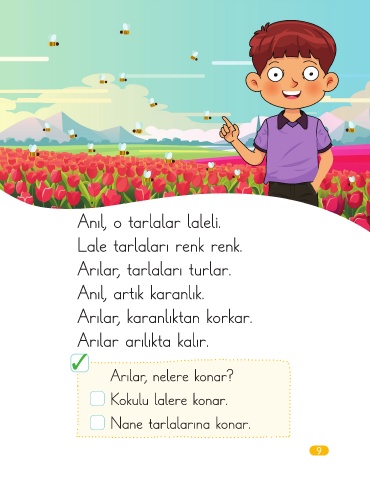 Anıl, o tarlalar laleli. Lale tarlaları renk renk. Arılar, tarlaları turlar. Anıl, artık karanlık. Arılar, karanlıktan korkar. Arılar arılıkta kalır. Arılar, nelere konar? Kokulu lalere konar. Nane tarlalarına konar. 9