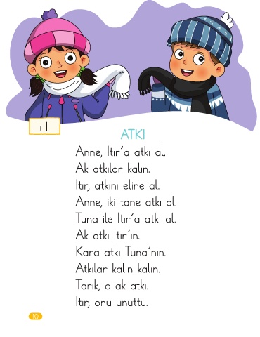 ı I ATKI Anne, Itır’a atkı al. Ak atkılar kalın. Itır, atkını eline al. Anne, iki tane atkı al. Tuna ile Itır’a atkı al. Ak atkı Itır’ın. Kara atkı Tuna’nın. Atkılar kalın kalın. Tarık, o ak atkı. Itır, onu unuttu. 10