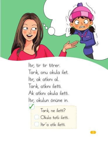 Itır, tir tir titrer. Tarık, onu okula ilet. Itır, ak atkını al. Tarık, atkını iletti. Ak atkını okula iletti. Itır, okulun önüne in. Tarık, ne iletti? Okula tatlı iletti. Itır’a atkı iletti. 11