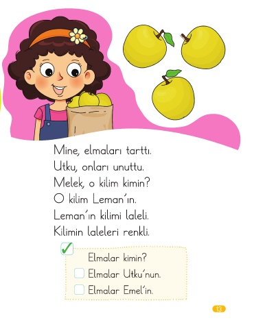 Mine, elmaları tarttı. Utku, onları unuttu. Melek, o kilim kimin? O kilim Leman’ın. Leman’ın kilimi laleli. Kilimin laleleri renkli. Elmalar kimin? Elmalar Utku’nun. Elmalar Emel’in. 13