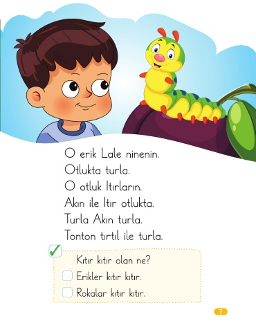 O erik Lale ninenin. Otlukta turla. O otluk Itırların. Akın ile Itır otlukta. Turla Akın turla. Tonton tırtıl ile turla. Kıtır kıtır olan ne? Erikler kıtır kıtır. Rokalar kıtır kıtır. 7