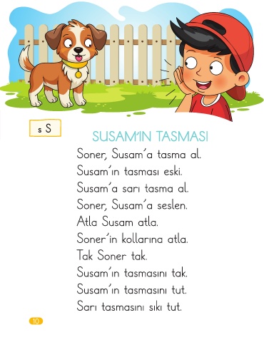 s S SUSAM’IN TASMASI Soner, Susam’a tasma al. Susam’ın tasması eski. Susam’a sarı tasma al. Soner, Susam’a seslen. Atla Susam atla. Soner’in kollarına atla. Tak Soner tak. Susam’ın tasmasını tak. Susam’ın tasmasını tut. Sarı tasmasını sıkı tut. 10