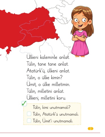 Ülkeni kaleminle anlat. Tülin, tane tane anlat. Atatürk’ü, ülkeni anlat. Tülin, o ülke kimin? Ümit, o ülke milletimin. Tülin, milletini anlat. Ülkeni, milletini koru. Tülin, kimi unutmamalı? Tülin, Atatürk’ü unutmamalı. Tülin, Ümit’i unutmamalı. 3