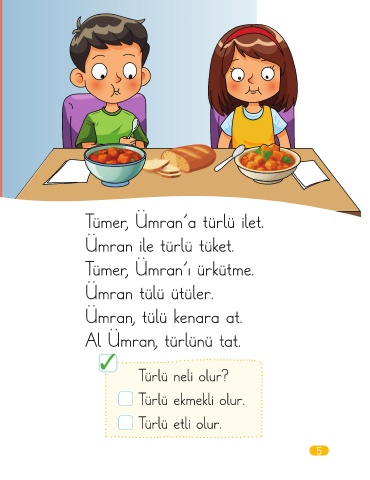 Tümer, Ümran’a türlü ilet. Ümran ile türlü tüket. Tümer, Ümran’ı ürkütme. Ümran tülü ütüler. Ümran, tülü kenara at. Al Ümran, türlünü tat. Türlü neli olur? Türlü ekmekli olur. Türlü etli olur. 5