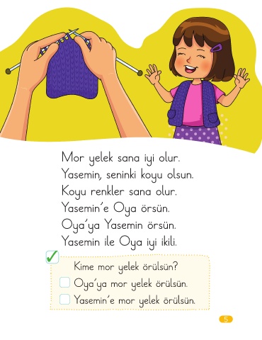 Mor yelek sana iyi olur. Yasemin, seninki koyu olsun. Koyu renkler sana olur. Yasemin’e Oya örsün. Oya’ya Yasemin örsün. Yasemin ile Oya iyi ikili. Kime mor yelek örülsün? Oya’ya mor yelek örülsün. Yasemin’e mor yelek örülsün. 5