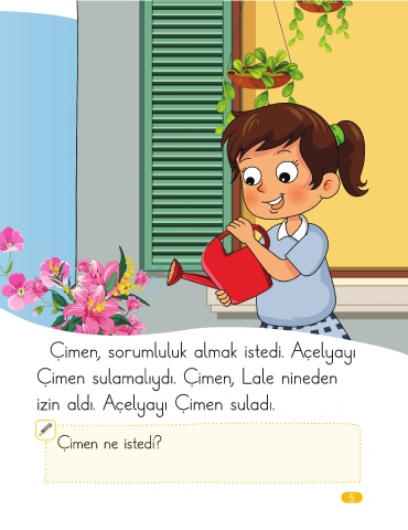 Çimen, sorumluluk almak istedi. Açelyayı Çimen sulamalıydı. Çimen, Lale nineden izin aldı. Açelyayı Çimen suladı. Çimen ne istedi? 5
