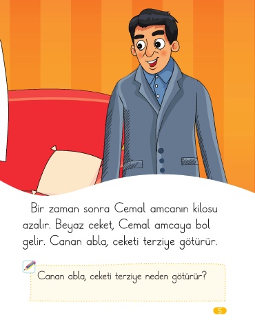 Bir zaman sonra Cemal amcanın kilosu azalır. Beyaz ceket, Cemal amcaya bol gelir. Canan abla, ceketi terziye götürür. Canan abla, ceketi terziye neden götürür? 5